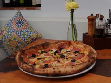 Tomato sauce, Italian mozzarella, ham, mushrooms, olives, artichoke
