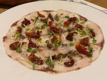 Cá Carpaccio đánh bắt tự nhiên trong ngày, dùng kèm cải mầm, dầu ô liu nguyên chất và sốt giấm cam. Vui lòng hỏi nhân viên để biết món cá trong ngày